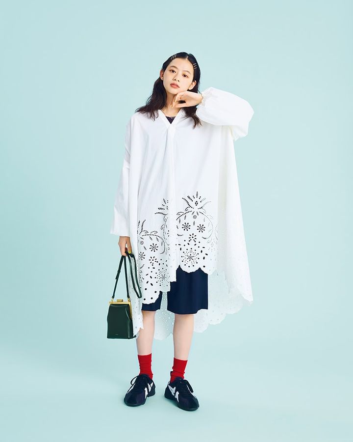 ショートパンツとスニーカーで挑む日は、カットワークとシルエットが優美なワンピで計算されたバランスに。
