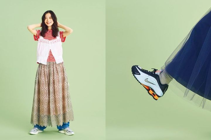配色もボリュームもインパクティブなハイテクスニーカーで甘口スカートとのコントラストを楽しんで。