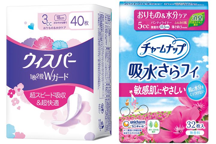 ちょっぴりもれが不安な方に。左)ウィスパー 1枚2役Wガード 3cc 18cm 40枚 ¥437(編集部調べ)(P&Gジャパン) 右)チャームナップ 吸水さらフィ 敏感肌にやさしい 微量用 5cc 17.5cm 32枚 ¥297〈編集部調べ〉(ユニ・チャーム)