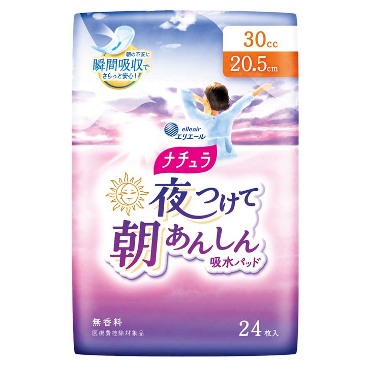 夜間に溜まった尿が朝もれても瞬間吸収。エリエール ナチュラ 夜つけて朝あんしん吸水パッド 30cc 20.5cm 24枚 ¥569 (大王製紙)