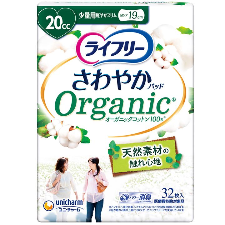 表面シートはオーガニックコットン100%。ライフリー さわやかパッド オーガニックコットン 20cc 19cm 32枚 ¥781(編集部調べ)(ユニ・チャーム)