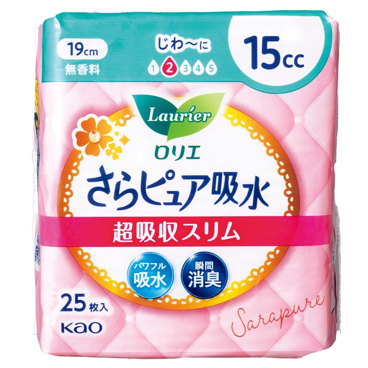 下着に響かないのに安心の吸水力。ロリエ さらピュア吸水 超吸収スリム 15cc 19cm 25枚 ¥462(花王)