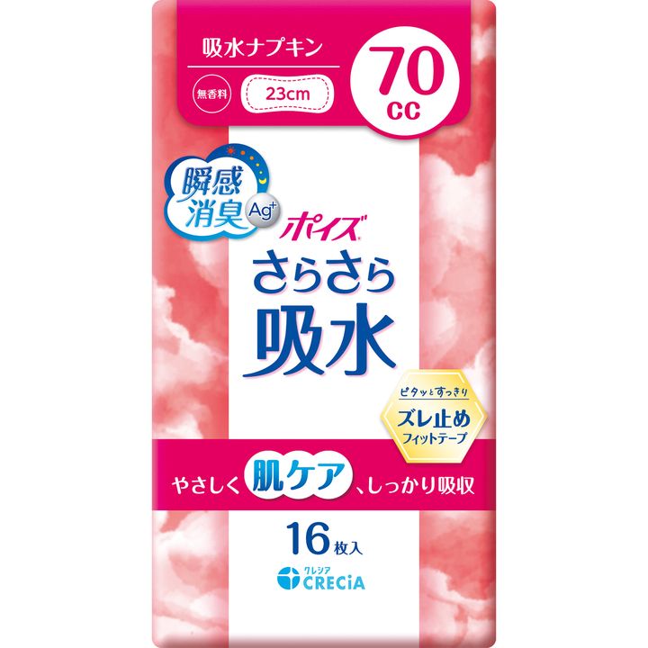 長時間の外出や量が増えたら。ポイズ さらさら吸水 吸水ナプキン 70cc 23cm 16枚 ¥506(日本製紙クレシア)