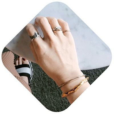 「リング、ブレスレット、バングル、すべてプリュイのポップアップストアで買ったものです。素材やゴツいものと繊細なデザインをミックスしても世界観が一緒なので、考えずともバランスがとれます。」