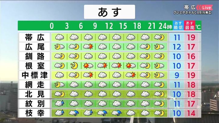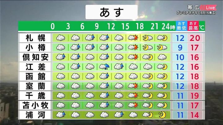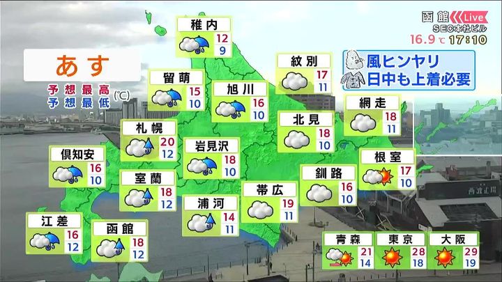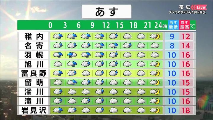 雲が広がり、日本海側や道南を中心に雨の降る時間があるでしょう。朝から気温は2ケタですが、日中は18度前後で、稚内は12度。海岸部は風が冷たく、ヒンヤリします。
