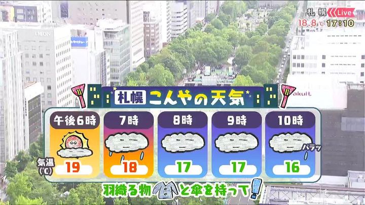 きょう4日(水)夜の札幌の天気ですが、予想よりも雲がわいています。夜7時前後は雨が降るため、傘をお持ちください。風は弱く、極端に冷えることはないですが、羽織る物があると安心です。