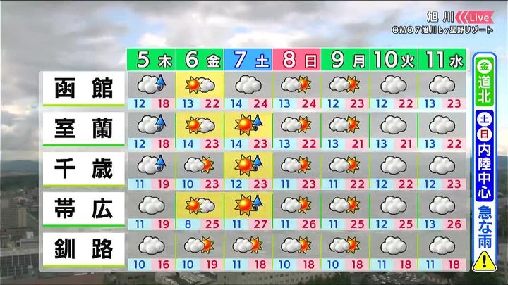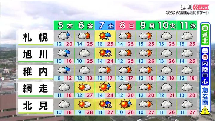 金曜から日曜は日差しが出て、気温は25度くらいと暑くなりますが、金曜は道北を中心に、土日は内陸の所々でにわか雨、旭川や北見など雷雨のおそれもあります。天気の急変に注意して下さい。