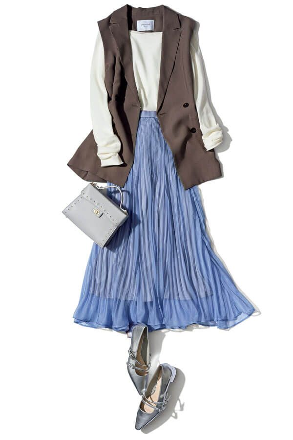 華スカートの引き締め役にブラウンのジレで品格としゃれ感を注入。いつものインコーデに羽織るだけでオフィスルックを洗練に導く。