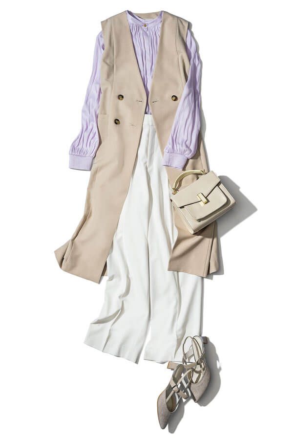 トレンチ風ジレで通勤服がランクアップ♡着回し力が高いミドル丈&パンツと相性抜群のロング丈