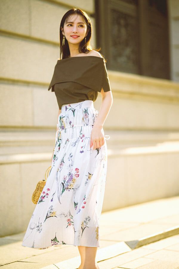 オフショルのカラーチェンジで花柄スカートの鮮度をアップ