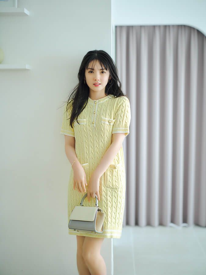 ケーブル編みのクラシカルなポロワンピが、コーデの主役に。イエローが子供見えしないように、ゴールドボタンや上品デザインのバッグで大人に振って。