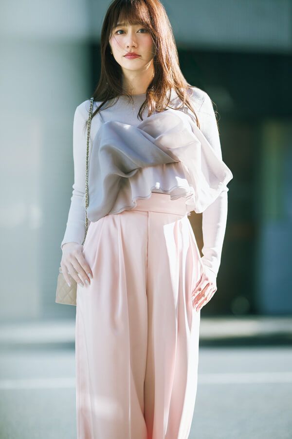 立体的なカシュクールキャミと、フィット感のあるシンプルニットの組み合わせでフェミニンさをゲット。上半身に厚みがあるぶん、ボトムはタック入りパンツでIラインをしっかり強調して。グレー×ピンクの配色ならグッと大人な雰囲気に。