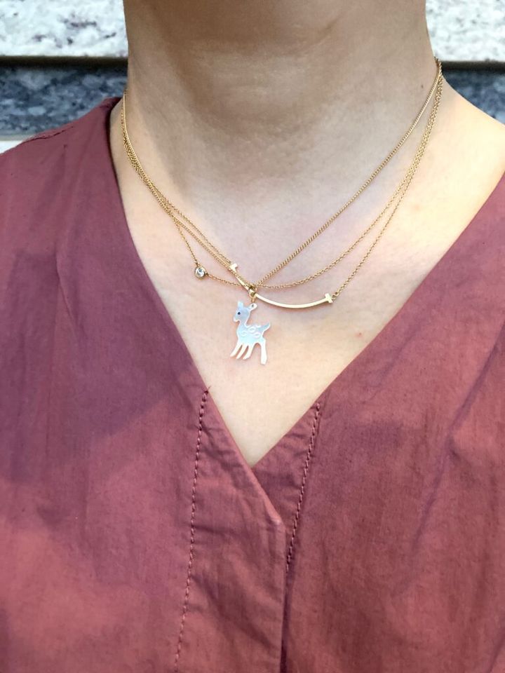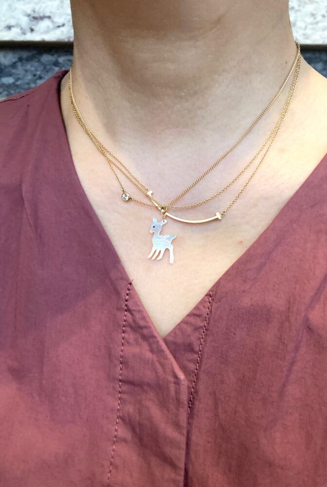 「ネックレスを2本つけたら少し寂しかったので、さらに重ねづけしてみました」という小西さん。「ティファニー」のネックレスに、韓国旅行をした際に購入したバンビのネックレスを重ねづけ。細めのゴールドで統一されているので、すっきりしつつも華やかな雰囲気に!