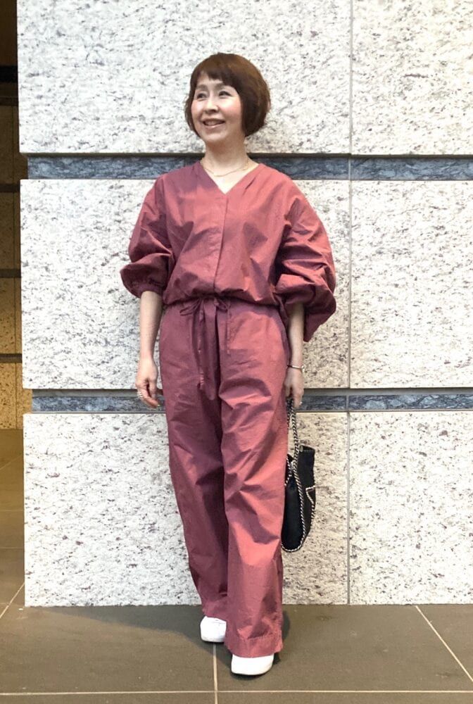 1枚で着映えるオールインワンですが、ともすると単調な着こなしになってしまうことも。小西さんはバッグやアクセサリーなど、小物でアクセントをつけることでこなれたおしゃれな着こなしに!また、カラーだけでなく、袖の形や襟周りの形など、ご自身に似合うものを選び取っているところも素敵です!