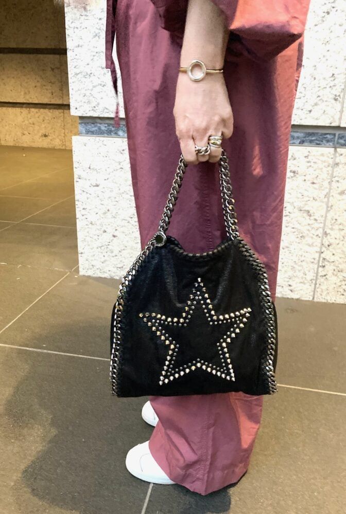 スター形にスタッズがついた「ステラマッカートニー」のバッグが、シンプルなオールインワンコーデのアクセントに!