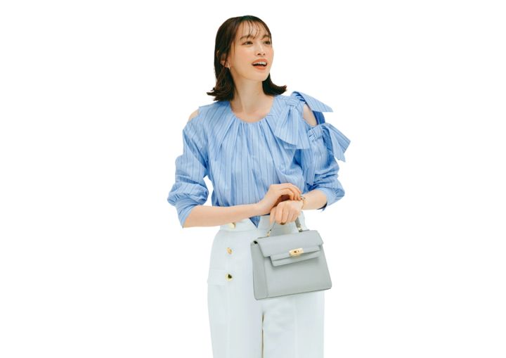 リボンショルダーブラウス¥18,700、マリンパンツ¥22,000/ともにマイストラーダ ワンハンドルバッグ¥3,848/grove(ワールド) ビジューバレエシューズ¥3,490/神戸レタス 時計¥22,000/マトウ(エイチエムエスウォッチストア表参道) パールイヤリング¥2,860/アネモネ(サンポークリエイト)