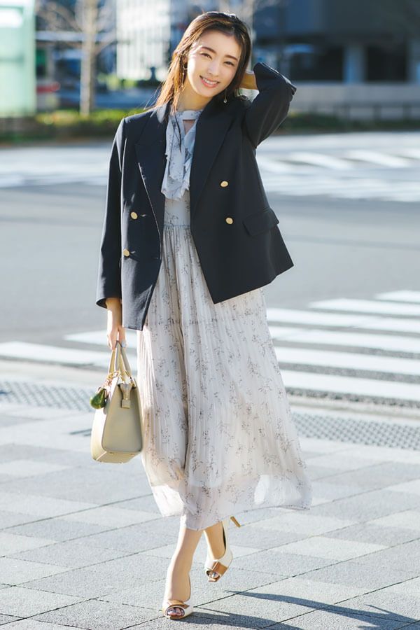 暑い日も涼しく着られるエアリー素材のフェミニンワンピは、テーラードジャケットをはおれば、お仕事モードにシフト可能。ピンクベージュの花柄×プリーツ加工で清楚フェミニンに。