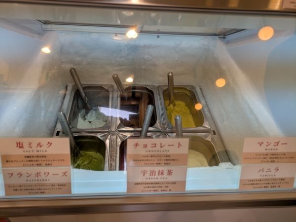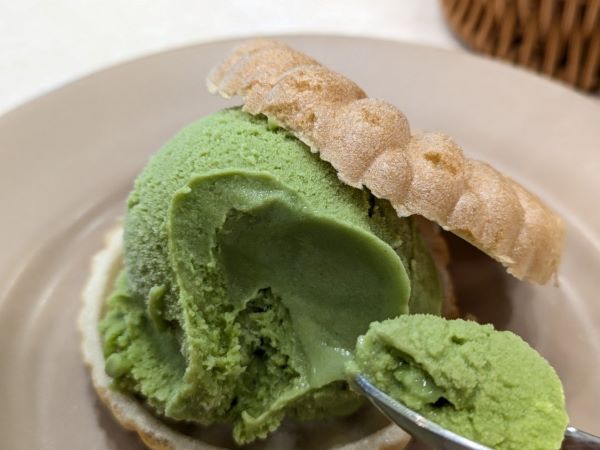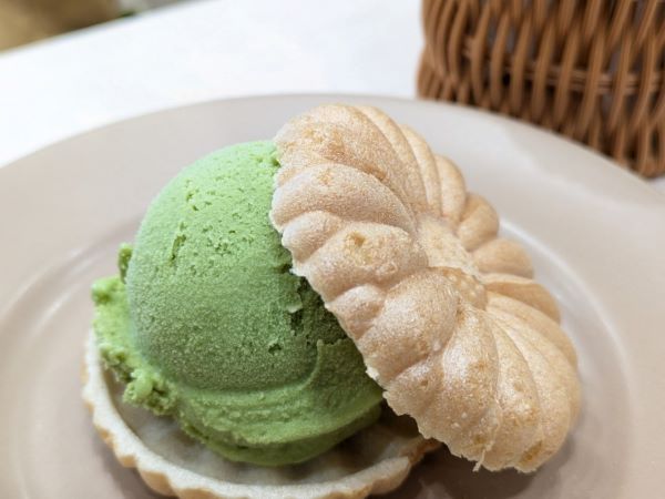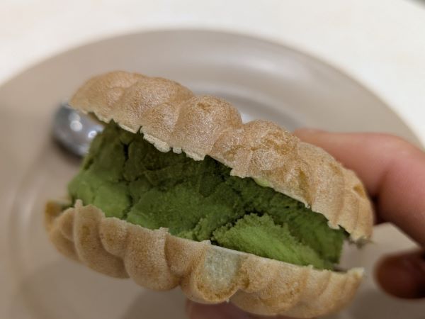 3店舗共通のメニューに加え、赤坂店限定のメニューの一つ「ジェラート最中サンド」をいただいてみることにしました。フレーバーは「塩キャラメル」「チョコ」「ほうじ茶」「抹茶」(各300円)の4種類です。一番人気は「塩キャラメル」だそうですが、私は「抹茶」をチョイス。