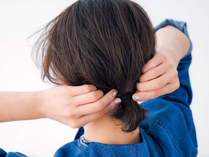 毛先を丸めてゴムの中に入れ込みます。優しい雰囲気に仕上がるので、ギリ結べる長さでお団子は難しい人におすすめのヘアアレンジ。最後にシュシュをプラスしてオシャレ見え。