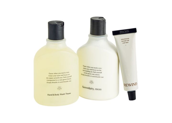 韓国生まれのビューティライフスタイルブランド〈モス オリジン〉が、日本展開を本格スタート。ハンド&ボディウォッシュ、ローション、クリームはそれぞれ、フレッシュな森を想起させる「PAUSE」と、シダーウッドで男女問わず使いやすい「REWIND」の2種の香り。