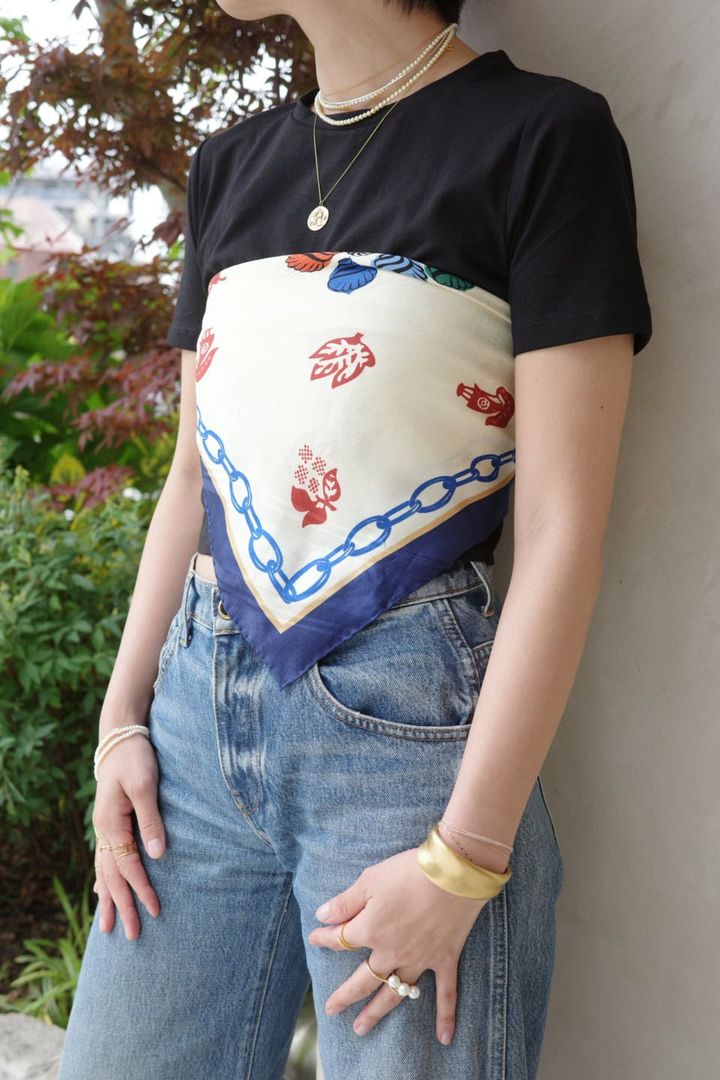 3. 【40代スナップ】Tシャツに 「ヴィンテージスカーフ」をビスチェ使い!