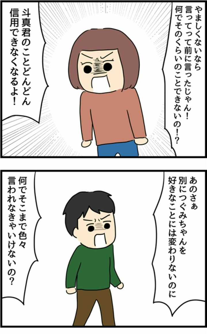以前、斗真は浮気をします。ですが、相手の連絡先をブロックするという条件で、一度は浮気を許し、つぐみは再構築をはかります。許した直後は、疑心暗鬼になってしまい、ささいなことでケンカしてしまうことが増えました。それでも何とか気持ちを切り替え、やっと穏やかな日々を過ごせるように。
