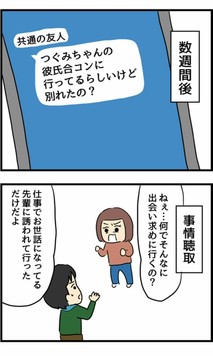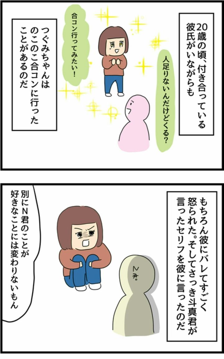彼氏がいるにも関わらず、合コンに参加したことがあるつぐみ。彼氏に怒られ、説教されますが、そのときは深く反省しませんでした。そして驚くべきことに、今の斗真とまったく同じセリフ「好きなことには変わりない」と発言していたのです。