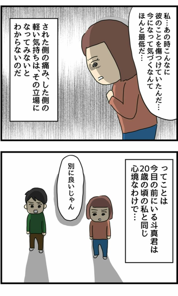 過去、自分がシタ側だった経験があるため、斗真の気持ちが手に取るようにわかります。そして今になって、サレタ側の心の痛みを感じ、これ以上、斗真を追及することができなくなってしまいました…。