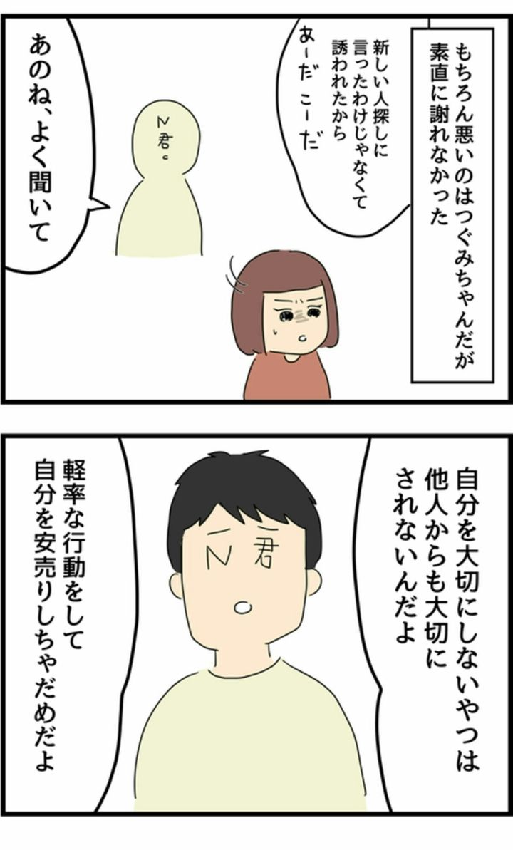 本作では、浮気を繰り返す彼氏に振り回され、次第に疲弊していく女性の姿が描かれています。軽い気持ちで相席屋や合コンに参加しているため、怒られても響かないのですね…。そればかりか、口うるさい彼女と思っているのかもしれません。
