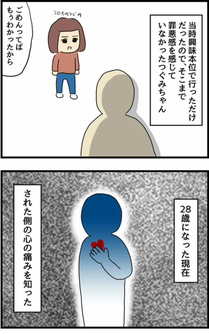 した側は、軽い気持ちだったかもしれませんが、された側は、裏切られたように感じ、ひどく傷つきますね。恋愛に限らず相手の立場になって考えることは、とても大切ですね。相手の気持ちを想像することができれば軽率な行動はなくなりそうです。