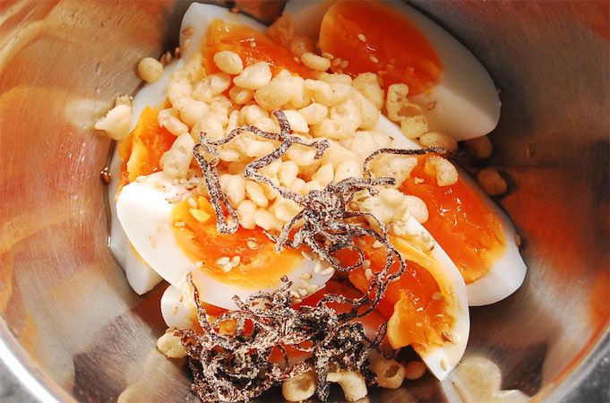 3. 【ゆで卵の裏ワザ】味付けは塩昆布の一撃!天かすやごま油の風味とコクが旨い「やみつきゆで卵」作ろう