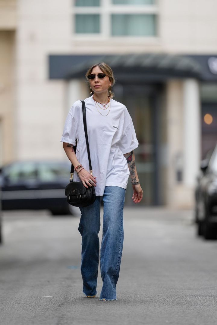バレンシアガBALENCIAGA)などが牽引してきたオーバーサイズTシャツは、今や春夏スタイルの定番。メンズコレクションから選ぶのもひとつの手で、体を包み込むようなフォルムは、ナチュラルに体型カバーも叶えてくれる。スタイリングの鍵は、ジュエリーやバッグなどの小物使い。リラックス感のあるシルエットだからこそ、ピリッと効かせたアクセサリーで“ラフすぎ”を回避するのが、大人の正解バランス。