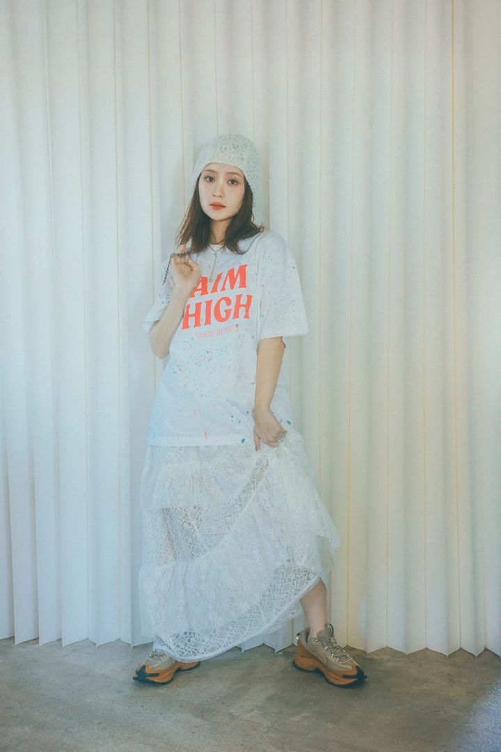 スニーカー[VOMELO ROAM]¥23,980/ナイキ スポーツウェア(ナイキ カスタマーサービス)、Tシャツ¥7, 150/バルミーデイズ(UTS PR)、下に重ねたレースキャミワンピ¥8,910/ジュエティ、ニット帽¥5,500/カオリノモリ(オーバーライド ルミネエスト新宿)、バッグ¥44,330/ミニットミュート(ハナ ショールーム)、ネックレス¥33,000、ダブルリング¥36,300/ともにラムダ