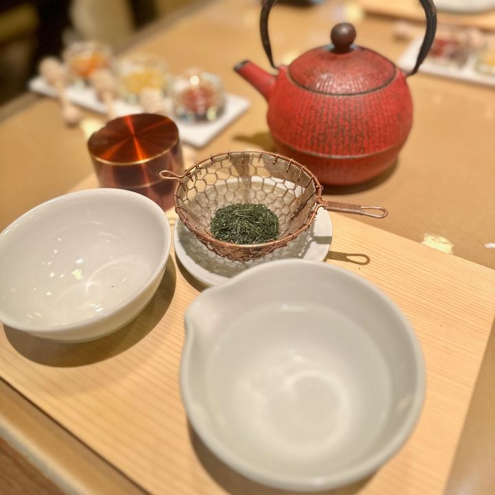 ウェルカムドリンクは、柳櫻園の玉露。鉄瓶のお湯を器でやや冷ましてから注ぎ、お茶の葉が十分開いたら完成。