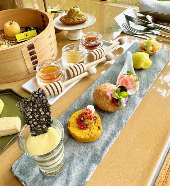 セイボリー6種(手前:玉蜀黍と黒ゴマのムース、南瓜のシフォン、パニプリ 塩豚とお花のサラダ レモン蜂蜜、海老のラビオリ仕立て、鴨肉のパテ タイムのベール、生ハムとメロンのタルト仕立て) 奥:コンディメント3種(Jarrah Honey / Redgum Honey / Blackbutt Honey)