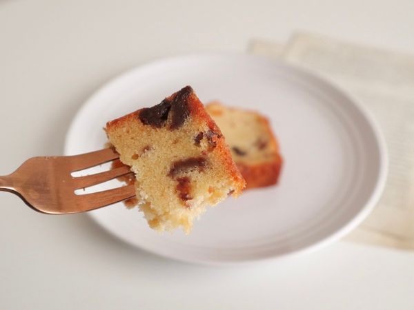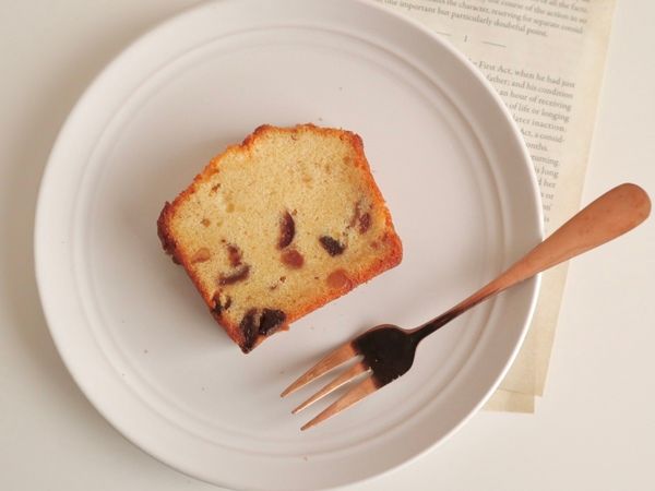 ベーキングパウダー不使用、バターの代わりに豆乳を使用した特製パウンドケーキ。こんがりした焼き色にレーズン、オレンジピール、クランベリーなどフルーツが散りばめられています。