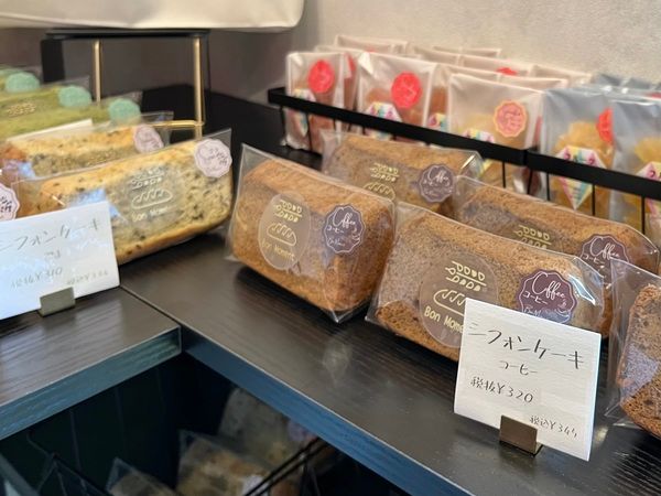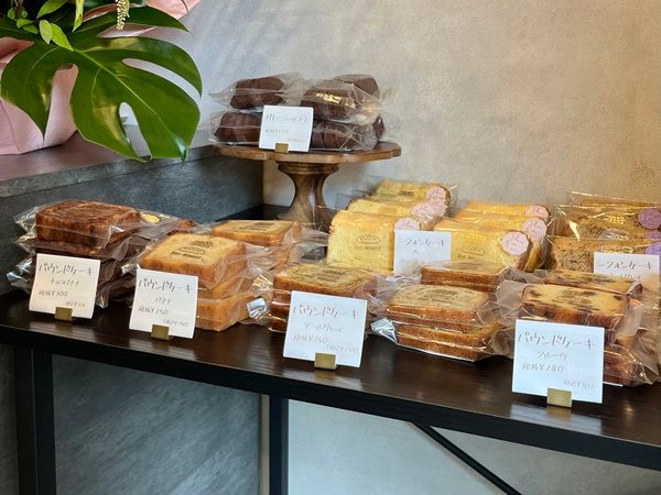 訪れたときには、食パン、メロンパン2種、ガトーショコラ、パウンドケーキ4種、シフォンケーキ5種、フルーツ琥珀糖4種、ジャム2種がラインナップしていました。