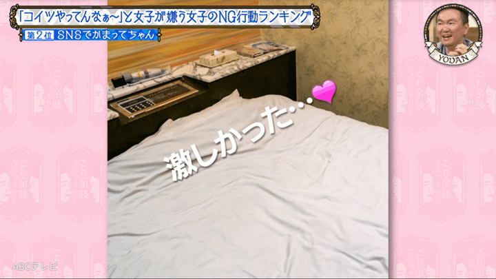 中には「男の人とお泊まりした感想みたいなのをストーリーに載せる子がいます」とのことで、「ホテルの布団の写真とかを載せて、激しかった♡みたいな」と語ると、スタジオから驚きの声があがった。
