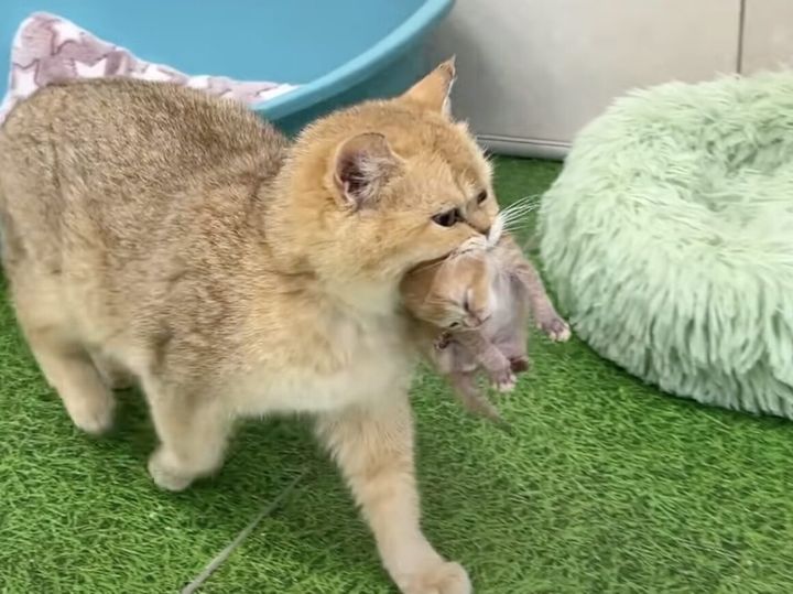 他の子猫をそっと咥えて、自分のベッドへ。