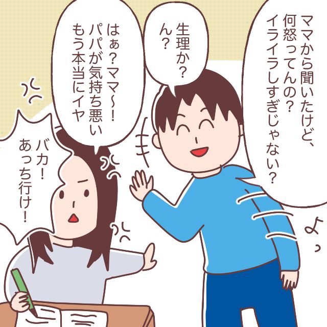 すると、「よっ、ママから聞いたけど、何怒ってんの?イライラしすぎじゃない?生理か?ん?」と娘にデリカシーのない言葉をかける夫。「はぁ?ママ~!パパが気持ち悪い!もう本当にイヤ」そう言った後、「バカ!あっち行け!」と夫に向かって言う娘。