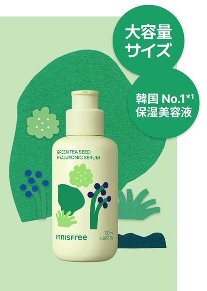 *1 韓国フェイシャルスキンケア市場の保湿カテゴリーにおけるイニスフリー美容液の2022年第1四半期から2023年第2四半期までの累計購入額(%)に基づく(Kantar Korea Worldpanel調べ) *2 チャ葉エキス(保湿成分) *3 原料特性に限る *4 角質層まで *5 ヒアルロン酸Na、ヒアルロン酸、ヒアルロン酸クロスポリマーNa、加水分解ヒアルロン酸、アセチルヒアルロン酸Na(全て保湿成分)*6 グリーンティーシード ヒアルロン セラムに対する臨床試験 (2022.12.05~12.26、成人女性30名)効果には個人差があります。/イニスフリー調べ
