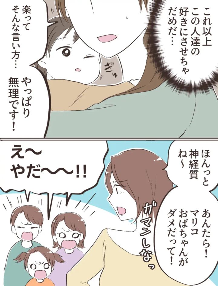「これ以上、この人達の好きにさせちゃだめだ・・」そう思い、「楽ってそんな言い方・・やっぱり無理です!」と言うと、「ほんっと神経質ね~。あんたら!マリコおばちゃんがダメだって!ガマンしなっ」チエさんがそう言うと、「え~やだ~~~!!」と文句を言う子ども達。