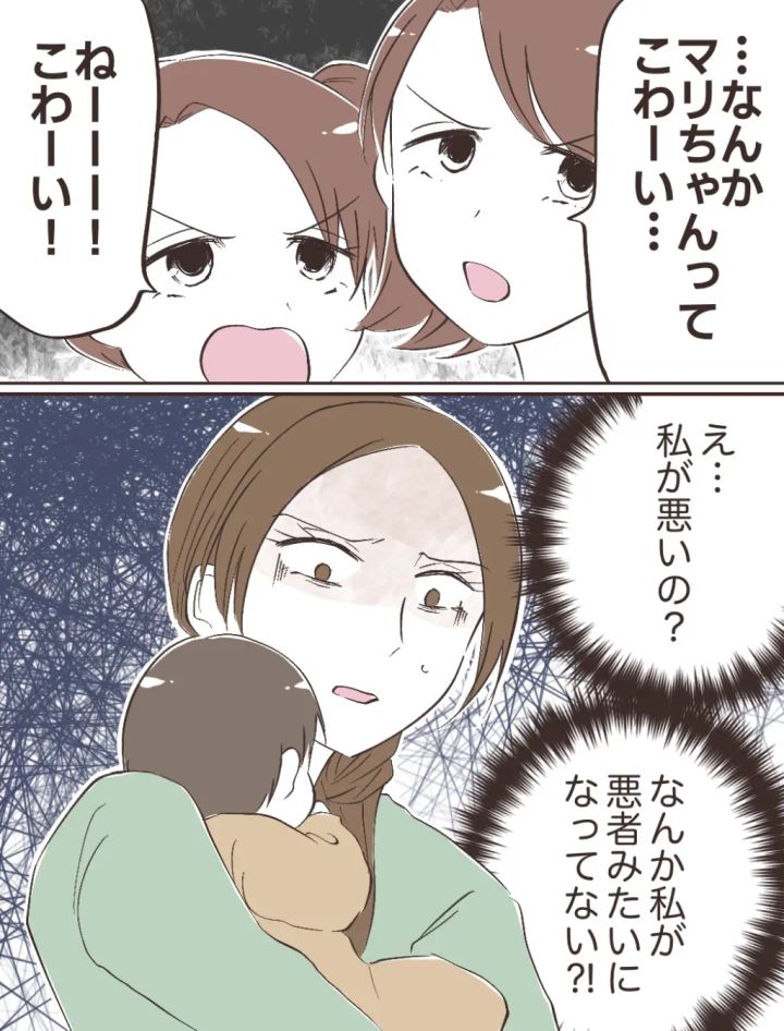「・・なんかマリちゃんってこわーい・・」「ねーーー!こわーい!」と冷たい目で言われ、「え・・私が悪いの?なんか私が悪者みたいになってない!?」と驚く私。