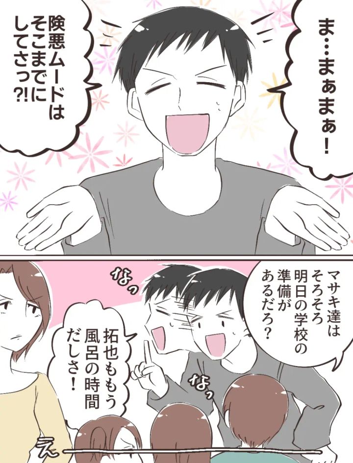すると、「ま・・まぁまぁ!険悪ムードはどこまでにしてさっ!?」とヒロキが間に入り、「マサキ達はそろそろ明日の学校の準備があるだろ?拓也ももう風呂の時間だしさ!」とそろそろお開きの雰囲気を出しかけると、