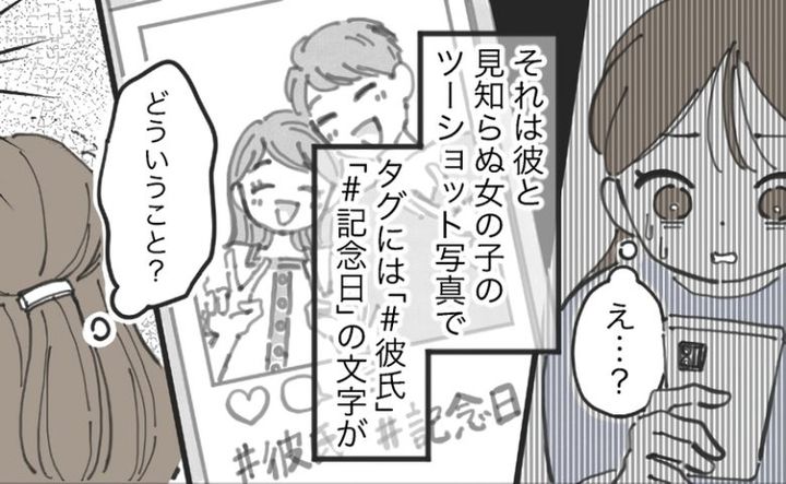 しかし……。デートから帰宅し、家でSNSを見ていたときです。私のタイムラインにある写真が流れてきました。その写真は、彼と……見知らぬ女性が仲良さそうに映っているもの。ハッシュタグには「#記念日」「#彼氏」「#彼女」というのが並んでいて……。