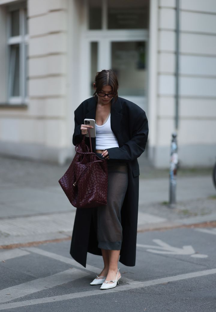 こちらも、ボッテガ・ヴェネタのバッグを着こなしの主役に。シックなカラーの「アンディアーモ」は、オーバーサイズのロングジャケット、タイトな白Tシャツにシアースカートというメリハリのあるシンプルコーデによくなじむ。存在感のあるビッグバッグは、洗練されたミニマルスタイルに取り入れるのが正解。