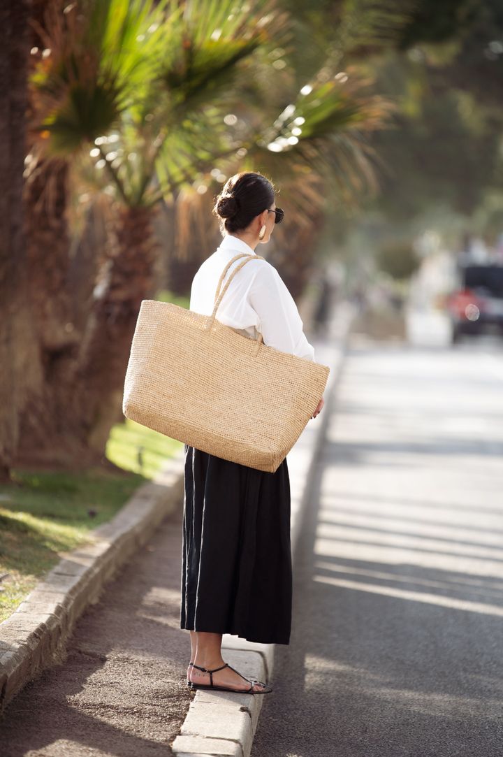 オフの日やリゾートへのお出かけに向けてゲットしておきたいのは、夏のムード満点の大きなカゴバッグ。ハリのある白シャツとエアリーな黒スカート、アンクルストラップのサンダルというきちんと感のあるカジュアルスタイルに、イヤリングやブレスレットでエレガンスを演出し、ラフになりすぎないよう仕上げて。