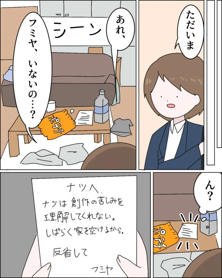 「ただいま」と帰っても誰もいない部屋。「あれ、フミヤ、いないの・・?」そう思って辺りを見回すと、「ん?」そこには「ナツへ ナツは創作の苦しみを理解してくれない。しばらく家を空けるから。 反省して フミヤ」と書かれた手紙が。