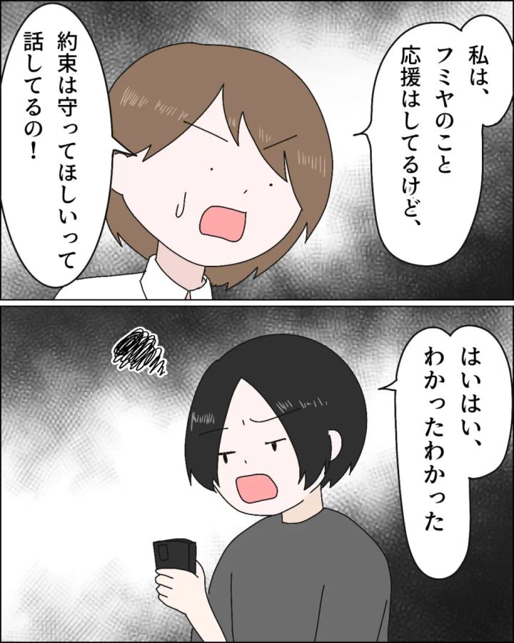 「私は、フミヤのこと応援はしてるけど、約束は守ってほしいって話してるの!」そう言うと、「はいはい、わかったわかった」とふてくされてスマホを触るフミヤ。