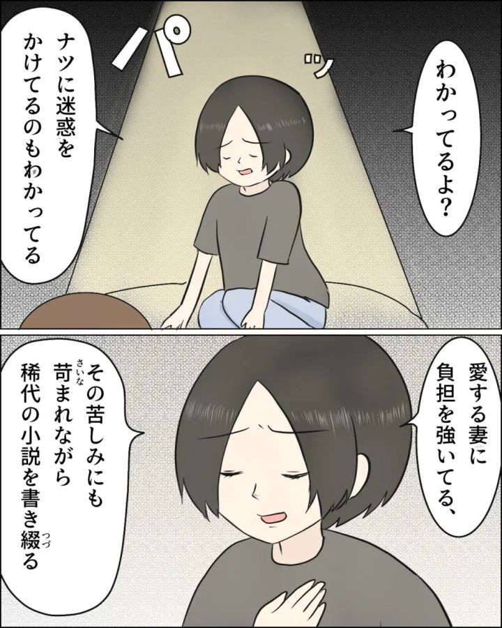 「わかってるよ?ナツに迷惑をかけてるのもわかってる。愛する妻に負担を強いてる、その苦しみにも苛まれながら稀代の小説を書き綴る」